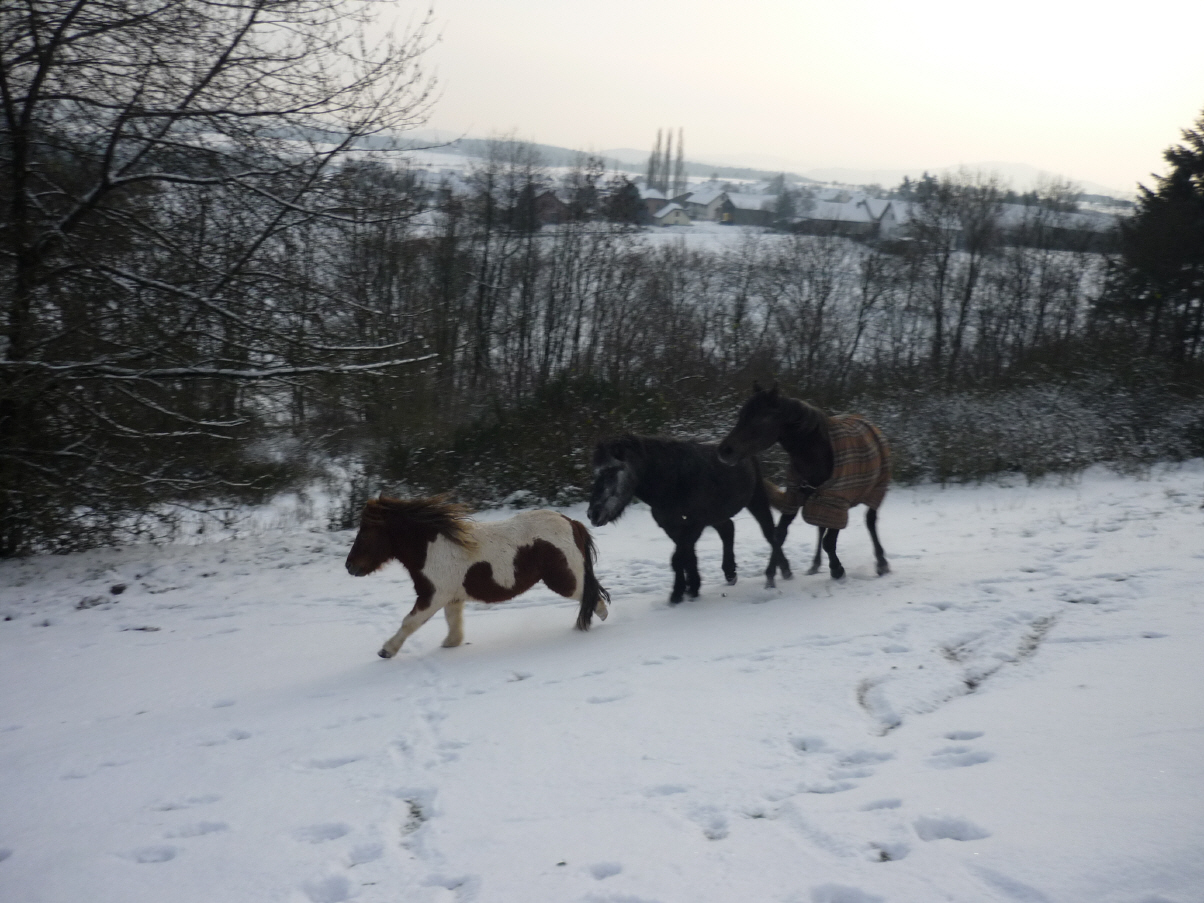Die Ponies werden artgerecht im Offenstall in einer kleinen Herde gehalten. Sie haben Heu zur freien Verfügung und im Sommer 24h Weidegang.