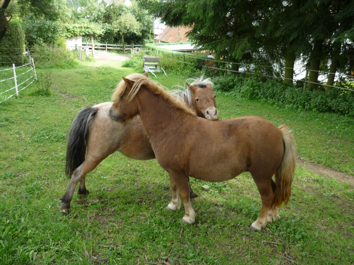 Die Ponies werden artgerecht im Offenstall in einer kleinen Herde gehalten. Sie haben Heu zur freien Verfügung und im Sommer 24h Weidegang.